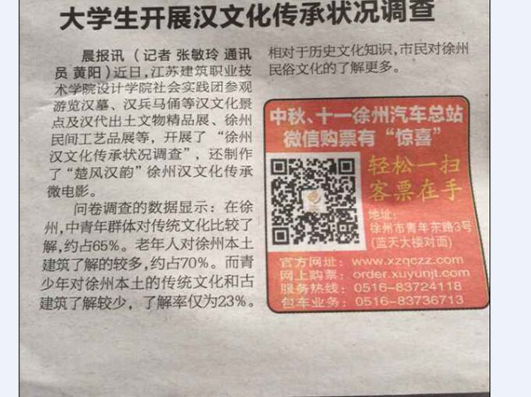 9月26日的《都市晨报》以《大学生开展汉文化传承状况调查》为题,报道了我校设计学院社会实践团开展汉文化传承状况社会调查系列活动,受到市民点赞。