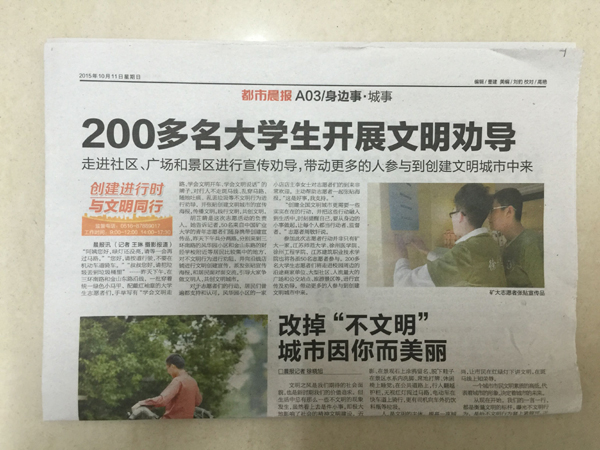 据悉,该活动由共青团市委、徐州市文明办组织开展,中国矿业大学、江苏建筑职业技术学院等5所在徐高校各派50名志愿者参与。我校志愿者的行动受到居民和商家的普遍认可和支持,徐州新闻、《都市晨报》等媒体纷纷报道了该活动。