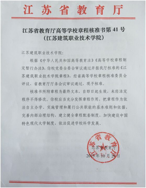 近日,学校收悉《江苏省教育厅高等学校章程核准书》(第41号)。核准书载明,经江苏省高等学校章程核准委员会评议,2015年10月29日,省教育厅厅务会议审议通过了《江苏建筑职业技术学院章程》,即日起生效。