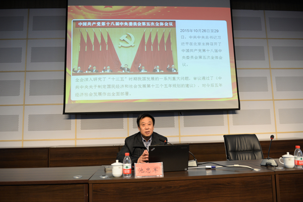 1月13日,我校在图书馆报告厅举行党的十八届五中全会精神专题讲座,中国矿业大学马克思主义学院院长、博士生导师池忠军教授受邀解读党的十八届五中全会精神。校领导吴光林、孙进、张登宏、梁惠、曾凡远以及副科级以上干部、教工党员、学生党员听取了讲座,党委副书记张登宏主持讲座。