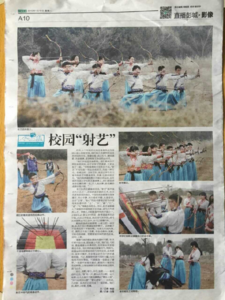 “我们学校没有体育系,他们都来自不同院系的学科,出于对射艺的喜爱,大家走到了一起。”学校体育部主任邓文才说,“射艺”不仅仅是一项运动或技艺,而是一种文化。组建这样一支射艺队,就是让学生在习练传统技艺中修身养性,传承、弘扬传统文化。“国内很多高校都在开展这项运动,去年底的全国大学生射艺邀请赛上,我们拿到团体排位赛的第一名,个人淘汰赛、排名赛的成绩也很不错。”