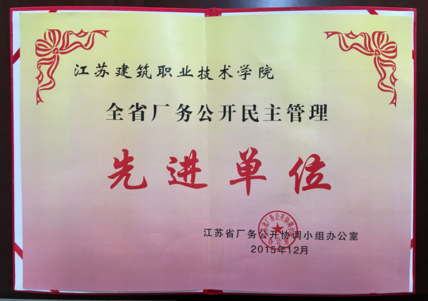 近日,根据江苏省厂务公开协调小组《关于表彰全省厂务公开民主管理先进单位的决定》(苏厂开办【2015】6号),我校被授予“全省厂务公开民主管理先进单位”称号。