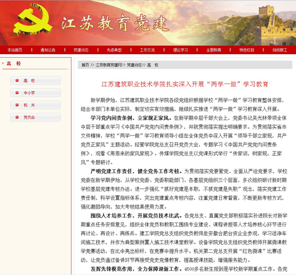 新学期伊始,江苏建筑职业技术学院各级党组织根据学校“两学一做”学习教育整体安排,结合本部门本单位实际,制定切实有效措施,继续扎实推进“两学一做”学习教育深入开展。
