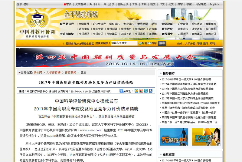 近日,武汉大学中国科学评价研究中心、中国教育质量评价中心联合中国科教评价网共同发布了“2017年中国高职高专院校竞争力排行榜”,我校名列第32位,比去年42位上升了10位。