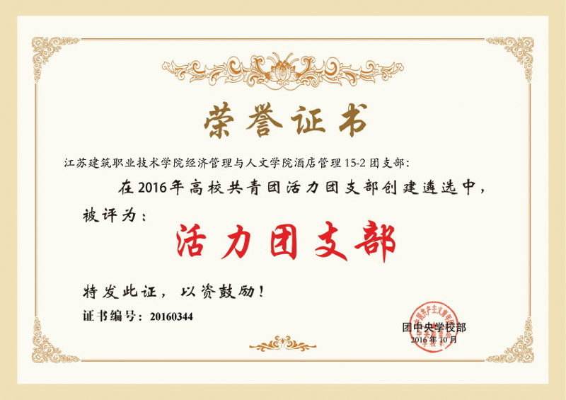 据悉,2016年秋季学期,共青团中央面向全国高校开展“活力团支部”创建遴选活动,我校经管学院酒店管理15-2团支部参加了评选,经资格审核、网络投票和评审等环节,荣获该项荣誉称号。(校团委 汤雪峰)