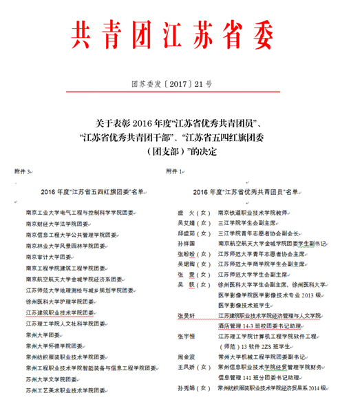 五四青年节之际,从团省委传来喜讯,我校团委荣获“江苏省五四红旗团委”称号,校团委书记助理、酒店14-3班张昊轩同学荣获“江苏省优秀共青团员”称号。这是今年我校荣获“江苏省共青团工作先进单位”以来,上级团组织对我校共青团工作的又一次充分肯定。