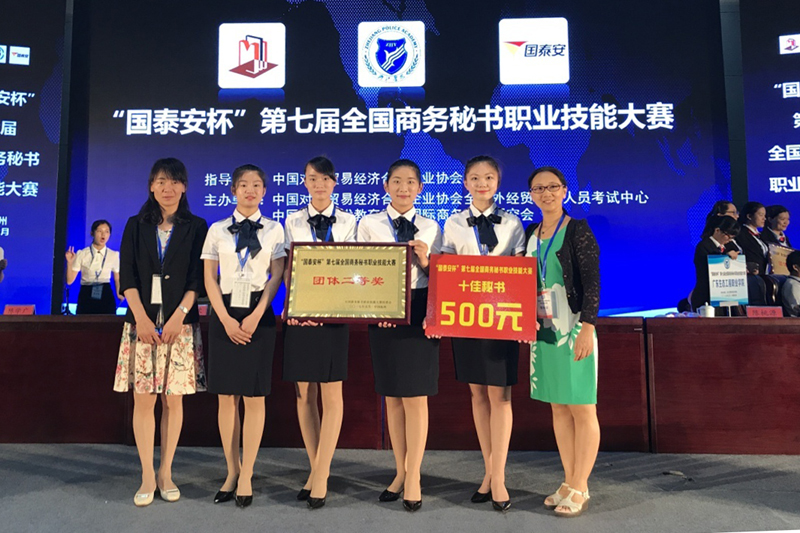 5月28日“国泰安”杯第七届全国商务秘书职业技能大赛在浙江警官职业学院落下帷幕,我校经管学院代表队荣获团体二等奖,文秘15-1班刘婷同学荣获“十佳秘书”称号,文秘15-1班徐雅文同学在秘书专项事务处理项目比赛中荣获一等奖。