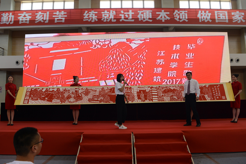 毕业生代表古建14-1班岳东海、广告14-2史志欣分别向学校赠送系列水彩画《建院景,母校情》和7.6米剪纸长卷《一草一木总关情》,副院长曾凡远代表学校接受纪念品捐赠。两幅作品以笔用刀剪接勾勒出了毕业学子的三年建院生活,饱含了他们对母校的深情厚谊,将在校史馆永久珍藏。