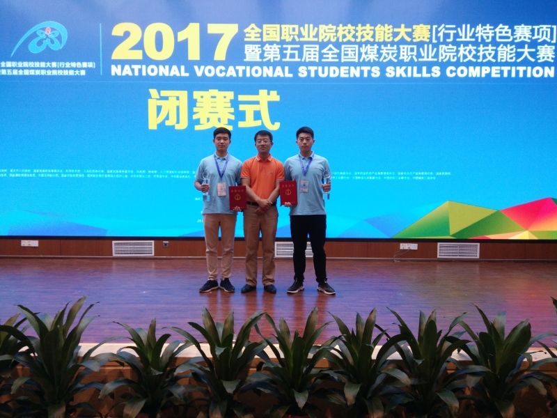 6月14—16日,2017年全国职业院校技能大赛(行业特色赛)暨第五届全国煤炭职业院校技能大赛在重庆举行。我校能源与交通工程学院张前程、胡锦龙两位同学组队代表江苏省参赛。在高职组“煤矿瓦斯检查”赛项中,两名选手凭借娴熟的操作技能和优异的竞赛成绩双双荣获一等奖。张修峰老师被评为优秀指导教师。