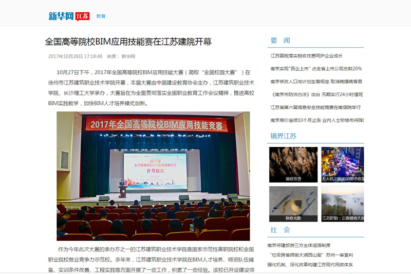 10月27日至28日,全国高等院校BIM应用技能大赛在我校举办,168家高职院校代表队1600余人参赛。中国网、新华网等网络媒体,《彭城晚报》、淮海网等地方媒体对此进行了报道。