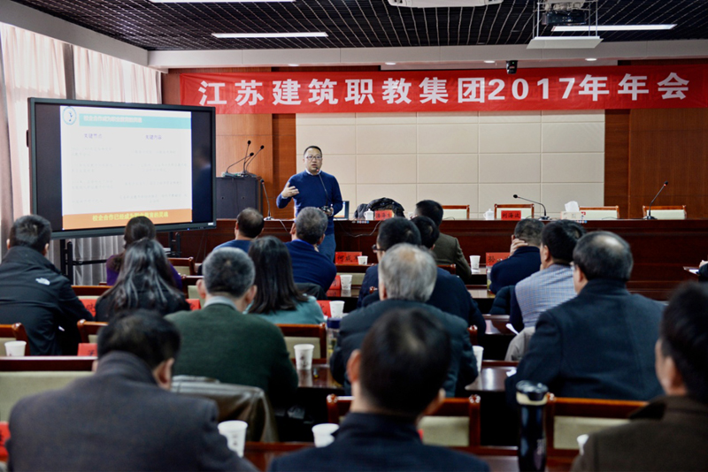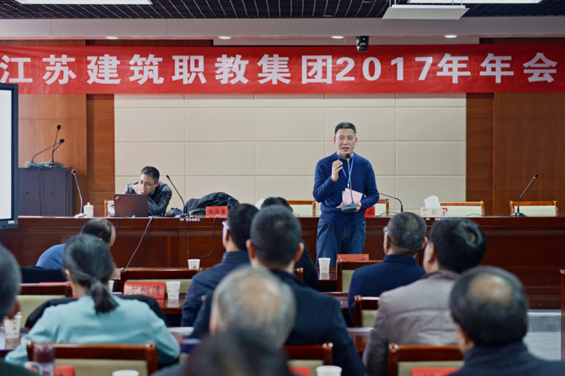 江苏建筑职教集团理事长、江苏建筑职业技术学院党委书记孙进教授代表江苏建筑职教集团,作了题为“服务国家战略,提升服务能力,为建成国家示范职教集团而奋斗”的报告。孙进理事长在职教集团工作报告中首先回顾了江苏建筑职教集团在2017年度所做的工作。他指出,2017年江苏建筑职教集团自身建设得到加强、理事单位互动交流常态化、理事单位合作内容更加丰富、理事单位合作成果丰硕、理事单位合作平台成效显著、集团合作育人形成机制、理事单位事业发展增强了集团实力。结合当前国家政策导向和职业教育集团化办学要求,孙进对建筑职教集团当前面临的机遇和挑战进行了深入分析。他指出,多年来,江苏建筑职教集团各项工作稳中有进、稳中求新,聚焦问题,厚植优势,创新共享。为谋求进一步发展,需要全省建筑院校、建筑企业进一步信息共享、技术支撑,共同为人才培养与培训工作搭起良好的平台。孙进号召,全体成员单位要共同努力,强化自身组织建设,推动体制机制创新,打造特色品牌,坚持内涵发展,提高人才培养质量,提升服务企业转型、技术革新能力,全面增强服务经济社会发展实力,努力开创江苏建筑职教集团特色发展新局面,为早日建成全国示范性骨干职教集团而共同努力奋斗。