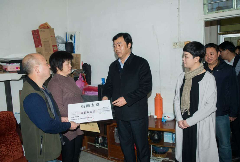 在张震鸣同学家中,孙进书记一行与张震鸣父母进行亲切交谈,询问了张震鸣同学的在家的生活点滴。孙进书记讲到,震鸣同学的崇高义举让社会广为感动,同时也对张震鸣父母深表感谢,感谢他们为学校培养了一个好学生,为社会树立了一个好榜样,希望他们保重身体,为震鸣好好地生活,并嘱咐如果生活有什么困难,要及时向学校提出来。