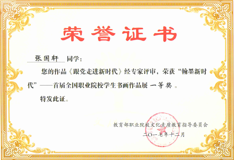 近日,由教育部职业院校文化素质教育指导委员会主办的“翰墨新时代”——首届全国职业院校学生书画作品展公布获奖名单,我校设计学院古建筑工程技术专业17级学生张国轩的书画作品《跟党走进新时代》荣获一等奖。