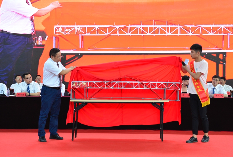 毕业生代表路桥15-1班张启迪向母校赠送“连心桥”,副院长蒋兆峰代表学校接受纪念品捐赠。“连心桥” 结构为双层,是公铁两用桥梁,它代表着学校与校友齐头并进,共赴辉煌,矢高39厘米,象征我校建校39周年,桥面长度2018毫米,代表2018届毕业生从2018年走向人生新征程,“连心桥”饱含了他们对母校的深情厚谊,将在校史馆永久珍藏。