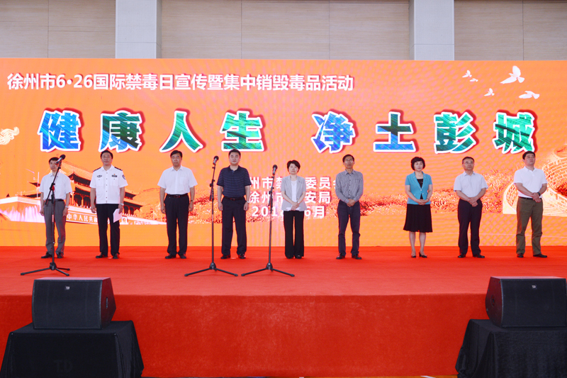 6月22日上午,徐州市“6.26”国际禁毒日集中宣传教育活动在我校体育馆举行。本次活动以“健康人生,净土彭城”为主题,采取主会场加毒品销毁地视频连线直播方式进行。徐州市委常委、政法委书记、市禁毒委主任韩冬梅,市人大常委会副主任李君超,副市长、公安局长、市禁毒委第一副主任王文生,市政协副主席张耀环,我校党委书记孙进,市禁毒委副主任、禁毒办主任、市公安局副局长周涛出席活动。周涛主持活动。