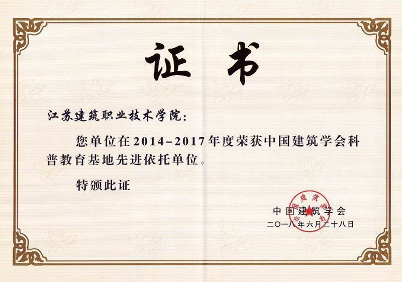 6月28日,中国建筑学会科普工作委员会工作会议暨2014-2017年度科普工作总结交流会在苏州大学举行,表彰各建筑科普教育基地在此期间做出的突出贡献,江苏建筑职业技术学院、哈尔滨工业大学建筑设计研究院等15家机构被评为中国建筑学会科普教育基地先进依托单位。