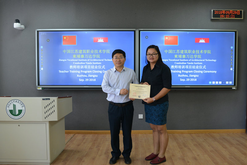 结业式上,沈士德院长致辞,对本次培训班的圆满举行表示祝贺,他希望两校的合作交流能够继续深入下去,下一步就专业共建合作、教师交流培训、学生双向流动项目等方面提出了建议。琳娜副校长表示,非常感谢江苏建院对于本次培训的高度重视和精心安排。通过此次培训,柬埔寨的老师们获益良多,为将来两校交流学习搭建了平台,希望培训班的老师们将所见所得、所学所想都带回柬埔寨,并要应用到实际教学活动中去,为柬埔寨高等教育发展做出贡献。沈士德为培训班全体学员颁发了结业证书和礼物,并与其合影留念。