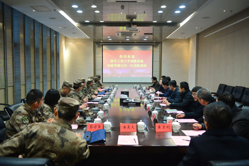 沈士德院长热情欢迎高建华一行来校访问,他重点介绍了我校的发展历程、办学特色、办学成效及未来发展战略。他表示我校作为前身为中国人民解放军基建工程兵第三技术学校的一所军校,有着光荣的红色基因、优良的军校传统和鲜明的军校文化,他希望依托陆军工程大学训练基地优质的军事文化、教学资源、科研力量和先进的军事训练技术和设施,加强双方在理论研究、专业建设、社会培训和学生综合素质培养等方面的交流与合作,促进和实现军地共建、资源共享。