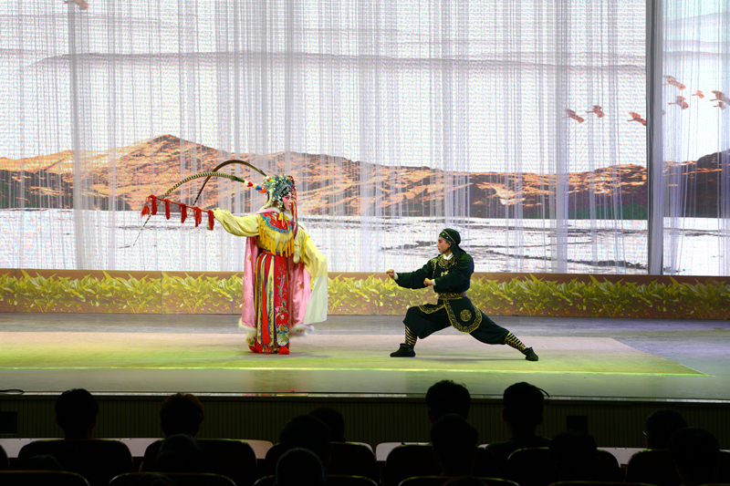 本场演出系江苏省2019年高雅艺术进校园拓展项目的重要组成部分,由江苏省梆子剧团呈现,共包含五出折子戏:《鸳鸯戏水》令人捧腹,讽刺了拜金者丑陋的面目嘴脸;《叫你一声大姐》主题鲜明,强调了诚信在社会生活中的重要性;《昭君出塞》生动经典,展现了传统艺术深厚的积淀与魅力;《闹重阳》、《过期牛奶》诙谐幽默,细致刻画了家庭生活中的点点滴滴。演出过程中,观众席掌声不断,舞台上演员们用细腻深邃的舞台表演和韵味醇厚的唱腔唱调为师生们带来了一场精美绝伦的视听盛宴。