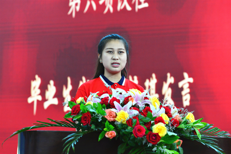 教师代表建造学院孙韬老师、毕业生代表财会16-1班曹艳琪同学发言。相关职能部门负责人、各学院党政负责人、全体专兼职辅导员和2019届3995名毕业生以及45名留学生毕业生参加典礼。