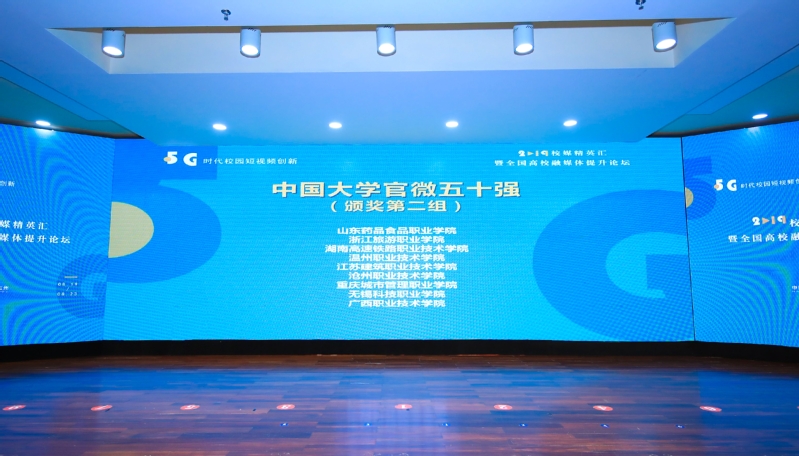 8月20日,由中国青年报社主办的“5G时代校园短视频创新——2019校媒精英汇暨全国高校融媒体提升论坛”在浙江杭州举行,论坛现场公布了2018-2019年度“全国大学官微百强”,“全国职业院校官微百强”排行榜,我校官方微信公众号斩获“2018-2019全国职业院校官微五十强”称号。