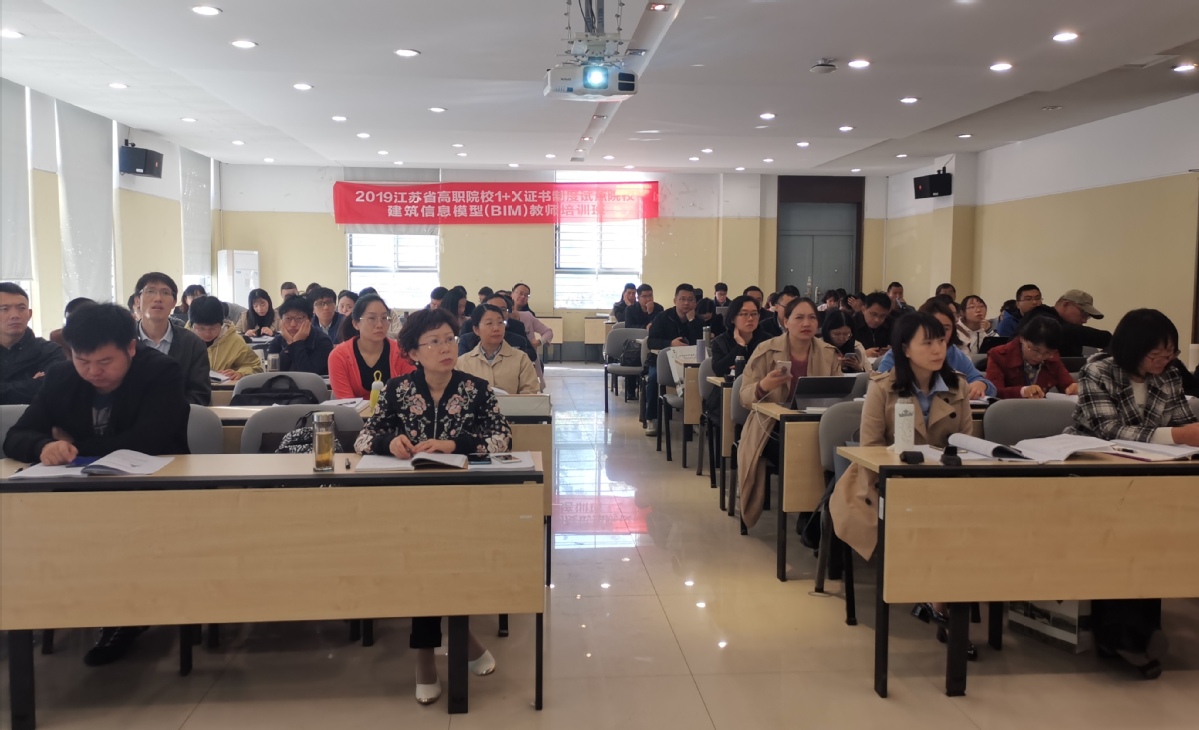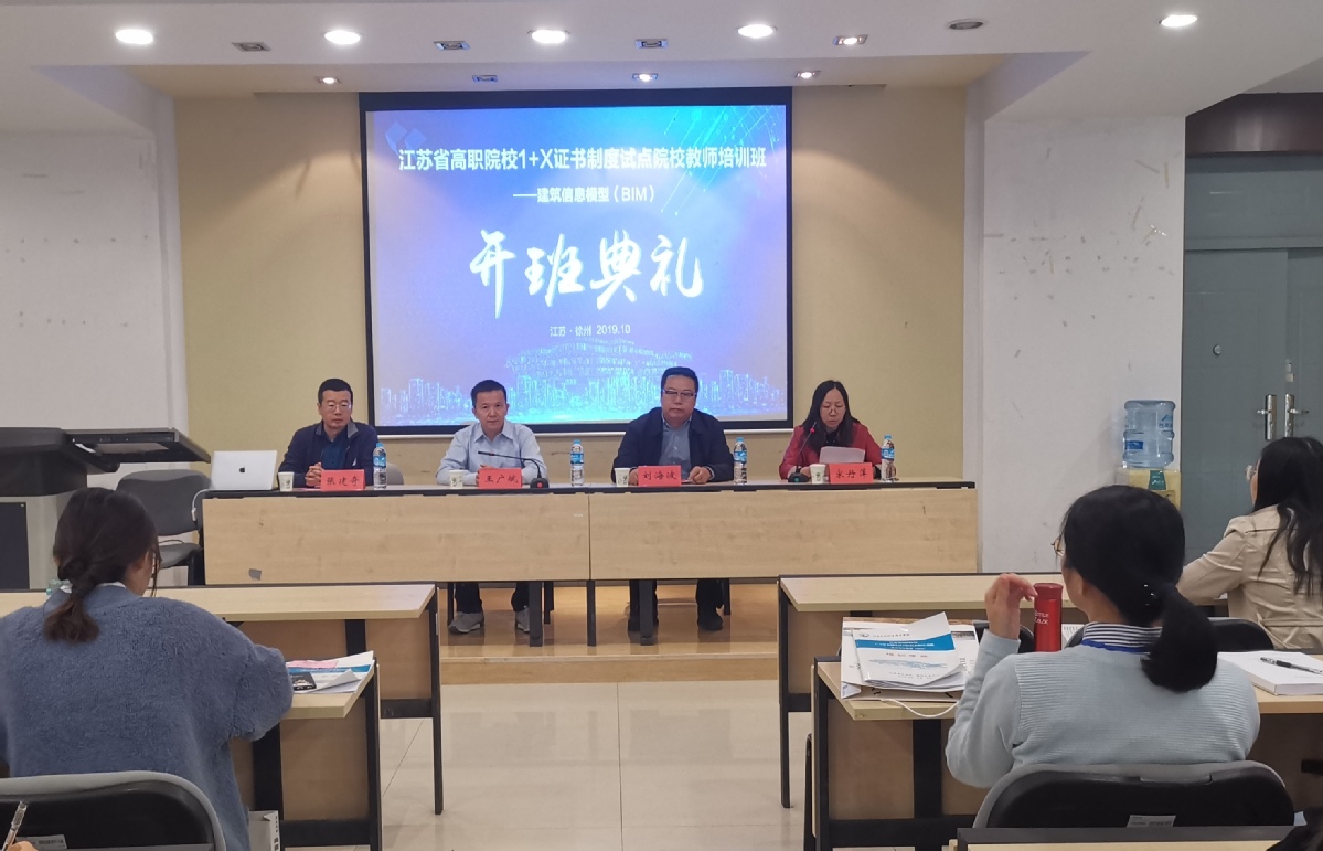 教育部教师工作司为贯彻落实《国家职业教育改革实施方案》,稳步推进“1+X”制度试点工作,10月14日上午,由江苏省高等职业教育教师培训中心主办、我校承办的2019年江苏省高职院校首批1+X证书制度试点院校建筑信息模型(BIM)教师第一期培训班在利亚楼报告厅顺利开班。我校副院长刘海波教授,中国建筑业协会管理现代化专业委员会常务理事、同济大学博士生导师王广斌教授,中国建筑科学研究院有限公司建研设计院BIM中心张建奇主任参加了开班仪式,开班仪式由我校人事处宋丹萍处长主持。
