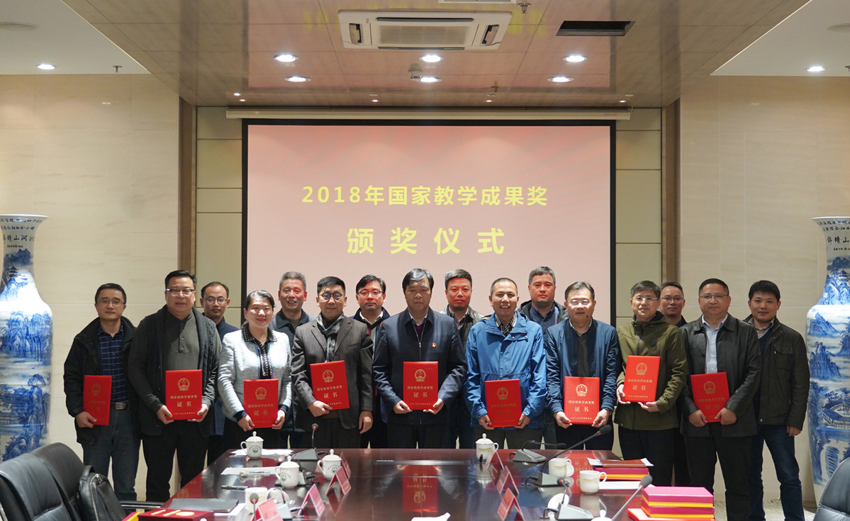 会议第二项议程是国家教学成果奖颁奖仪式,由刘海波主持。曾凡远对2018国家教学成果奖获奖项目进行成果总结,他从项目研究背景、成果内容、解决的科学问题、成果创新点以及应用推广情况等方面介绍了项目成果。孙进宣读了《教育部关于批准2018年国家级教学成果奖获奖项目的决定》文件,希望获奖人员珍惜荣誉、再创佳绩,并为获奖人员进行颁奖。