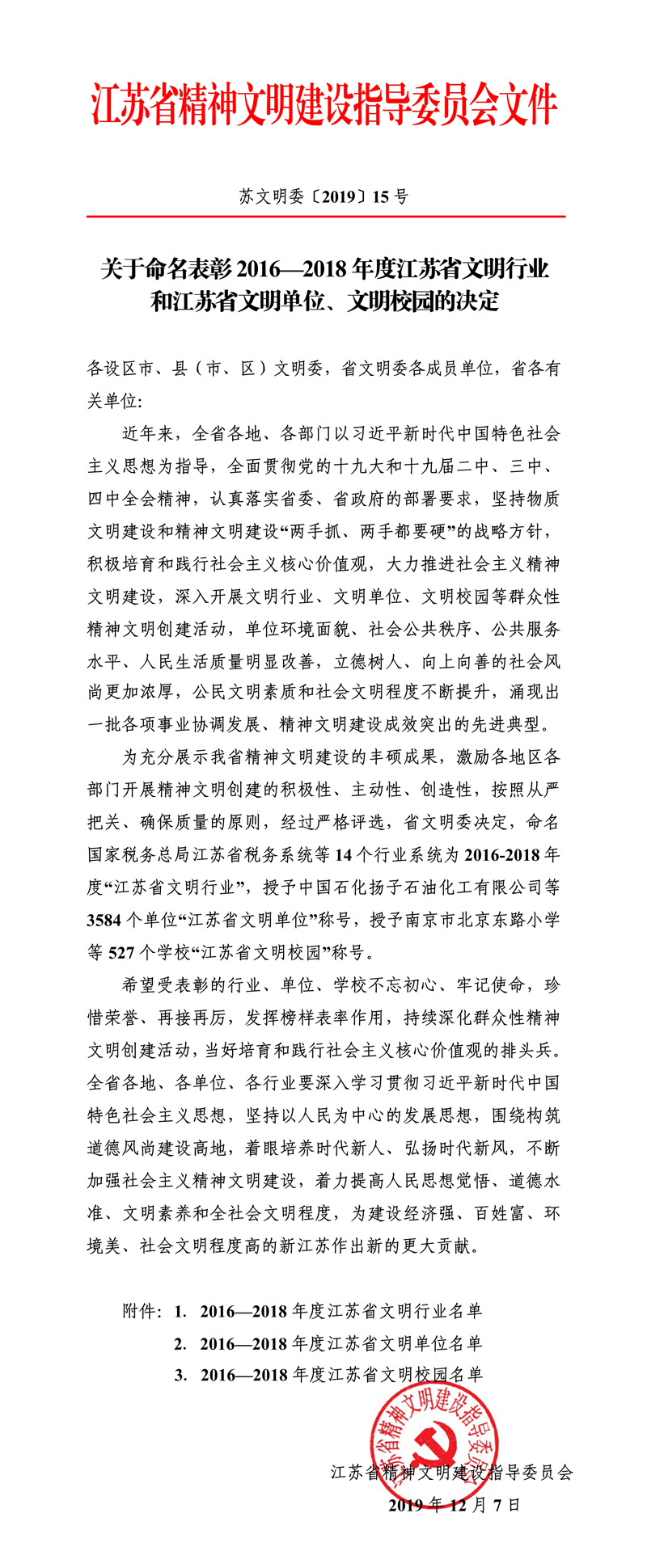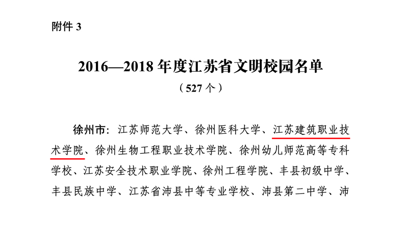 12月7日,江苏省精神文明建设指导委员会下发《关于命名表彰2016—2018年度江苏省文明行业和江苏省文明单位、文明校园的决定》,我校被授予“江苏省文明校园”荣誉称号。
