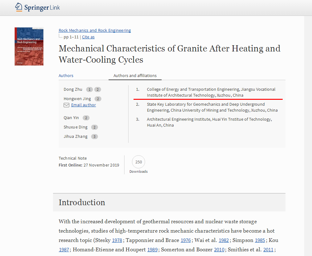 近日,我校交通工程学院朱栋博士的研究成果“Mechanical characteristics of granite after heating and water-cooling cycles”在国际著名的岩石力学期刊《Rock Mechanics and Rock Engineering》(一区,综合影响因子4.10,拒稿率近90%)上发表,江苏建筑职业技术学院为第一署名单位。