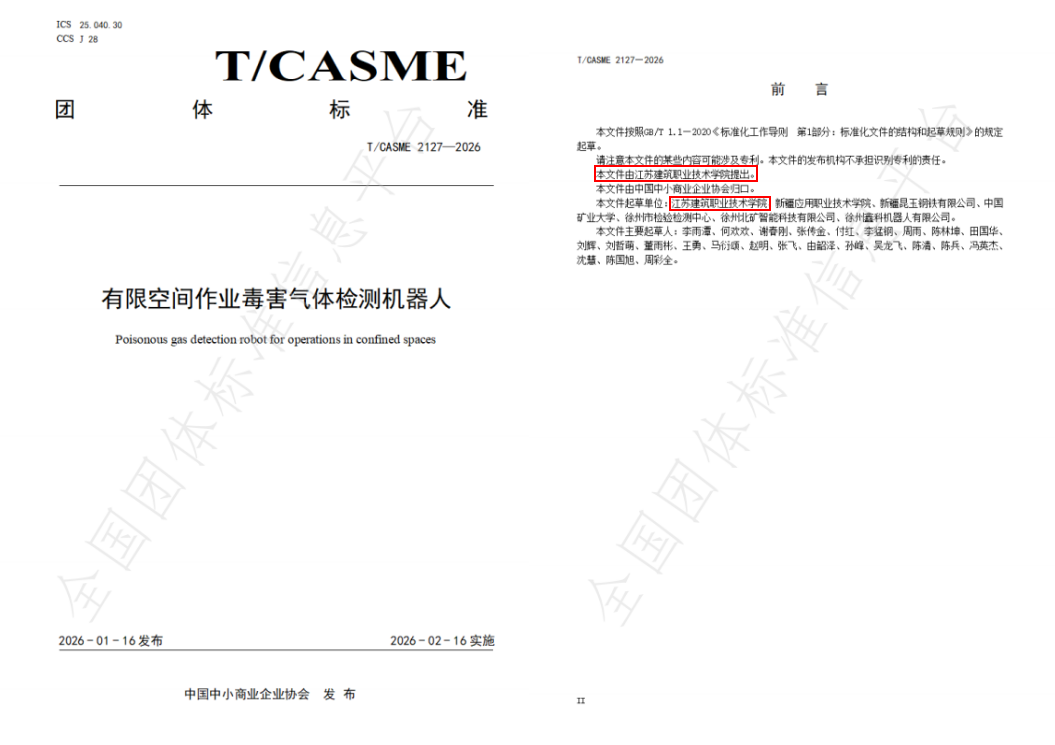 近日,由我校牵头,联合新疆应用职业技术学院等多所院校及企业共同起草的T/CASME2127-2026《有限空间作业毒害气体检测机器人》团体标准正式发布,并于2026年2月16日起实施。该标准是国内首个针对有限空间作业毒害气体检测机器人的专项团体标准,填补了该领域技术规范空白,为相关装备的研发、生产、检验提供了统一技术依据,彰显了我校在智能建造、工业机器人领域的技术研发与标准制定能力,助力行业安全生产与高质量发展。